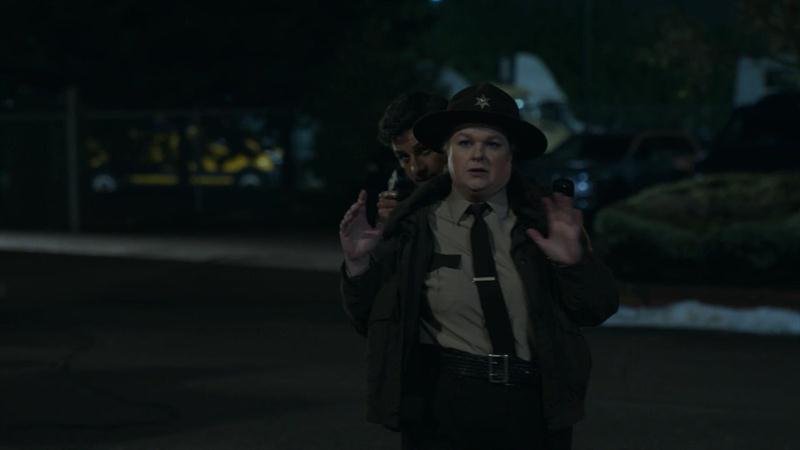 Sheriff Mike and Deputy Liv confront Joseph in this scene from Resident Alien Season 3, Episode 7: "Here Comes My Baby."